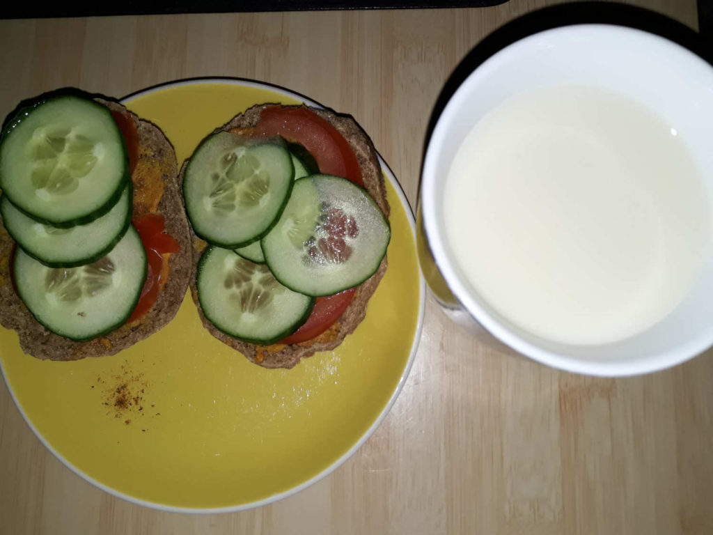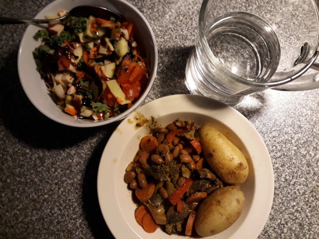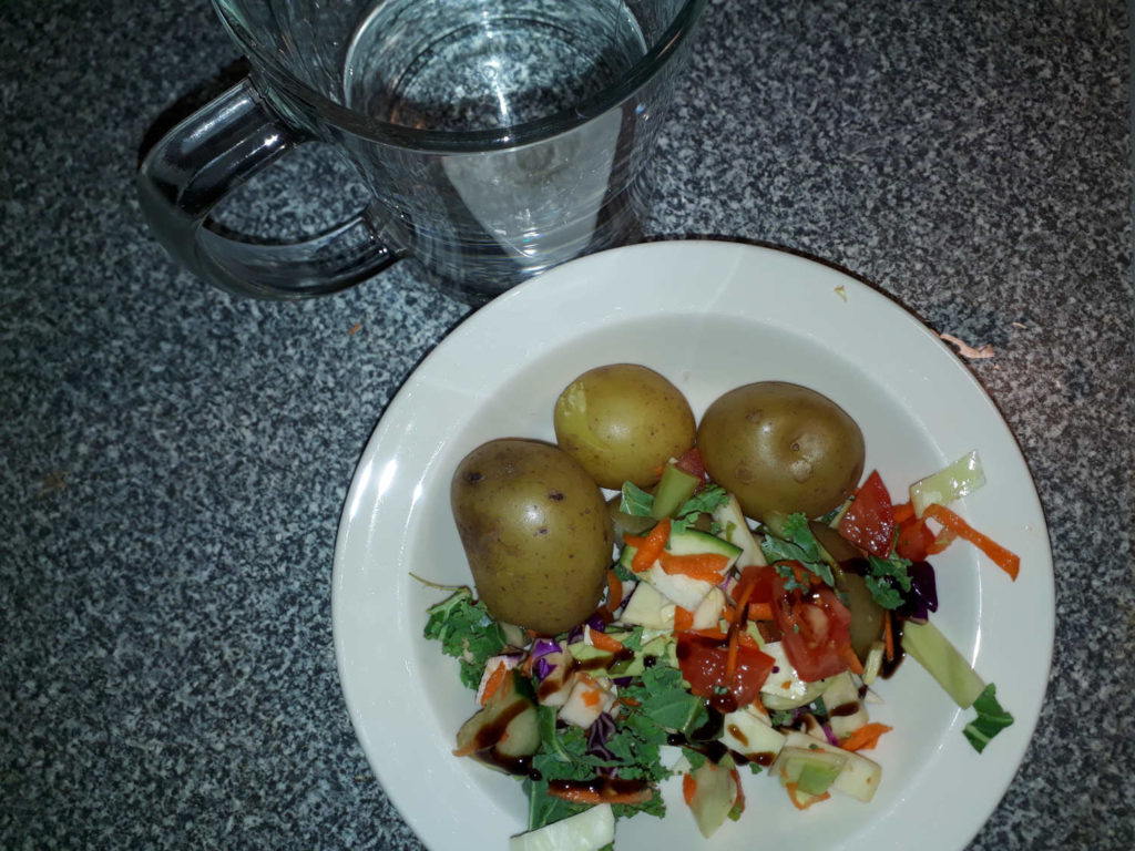 Keitin potut, ja onneksi on aina iso salaatti jääkaapissa valmiina. Melkein aina. Leipien jälkeen nyt ei ihan täyttä annosta tarvikaan, ja olipa hyviä paljaita pottuja. Tällä aterialla pitäisi saada vielä unet tälle yölle… ZzzzzzZZzzz……