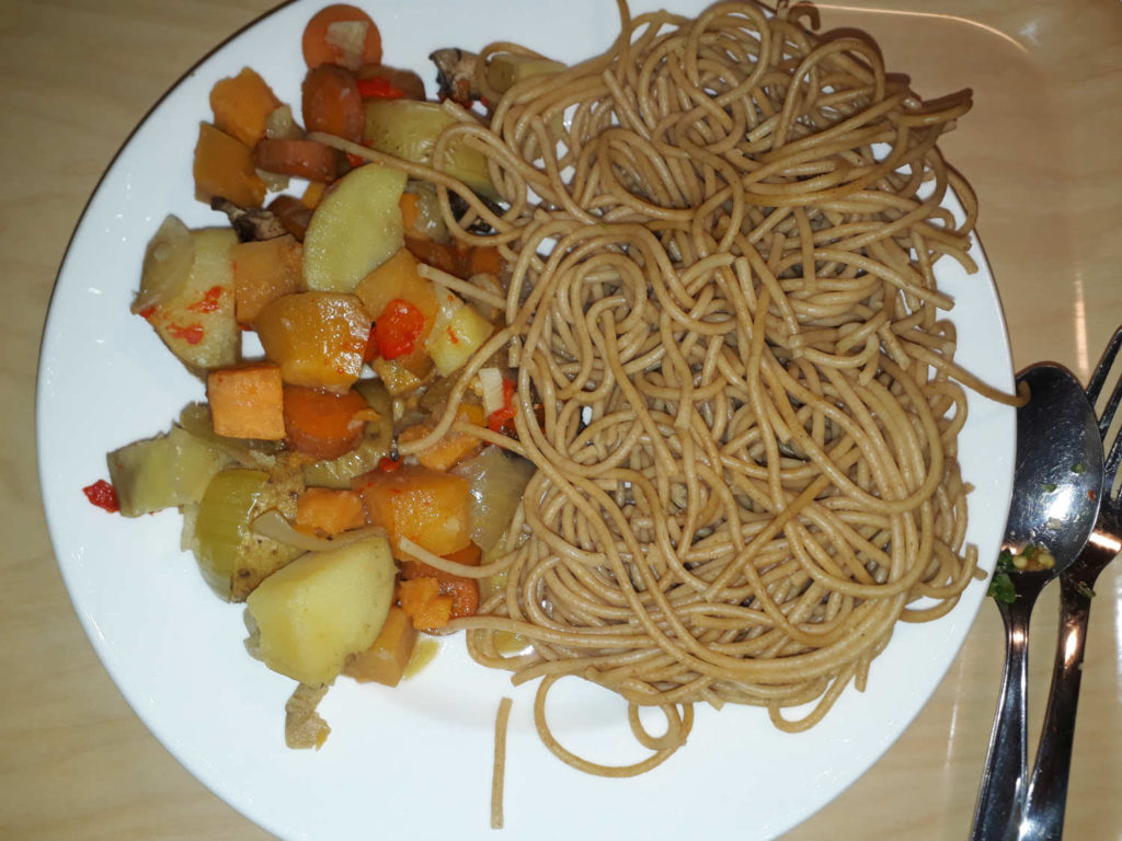Ainekset: Täysjyväspagettia, perunaa, bataattia, lanttua, valkosipulia, sipulia, paprikaa ja porkkanaa(toistamiseen, kun sitä oli tuossa toisessakin pakastevihannespussissa vahingossa…) sekä herkkusieniä