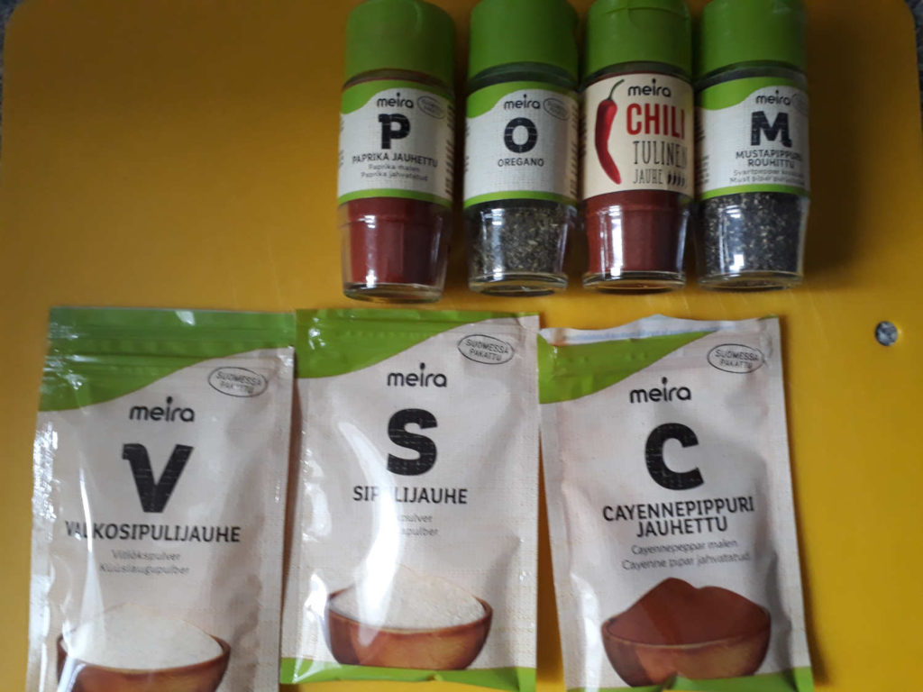 Ainekset: Valkosipulijauhe, sipulijauhe, cayennepippuri, paprikajauhe, oregano, chilijauhe ja mustapippuri