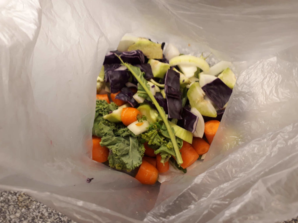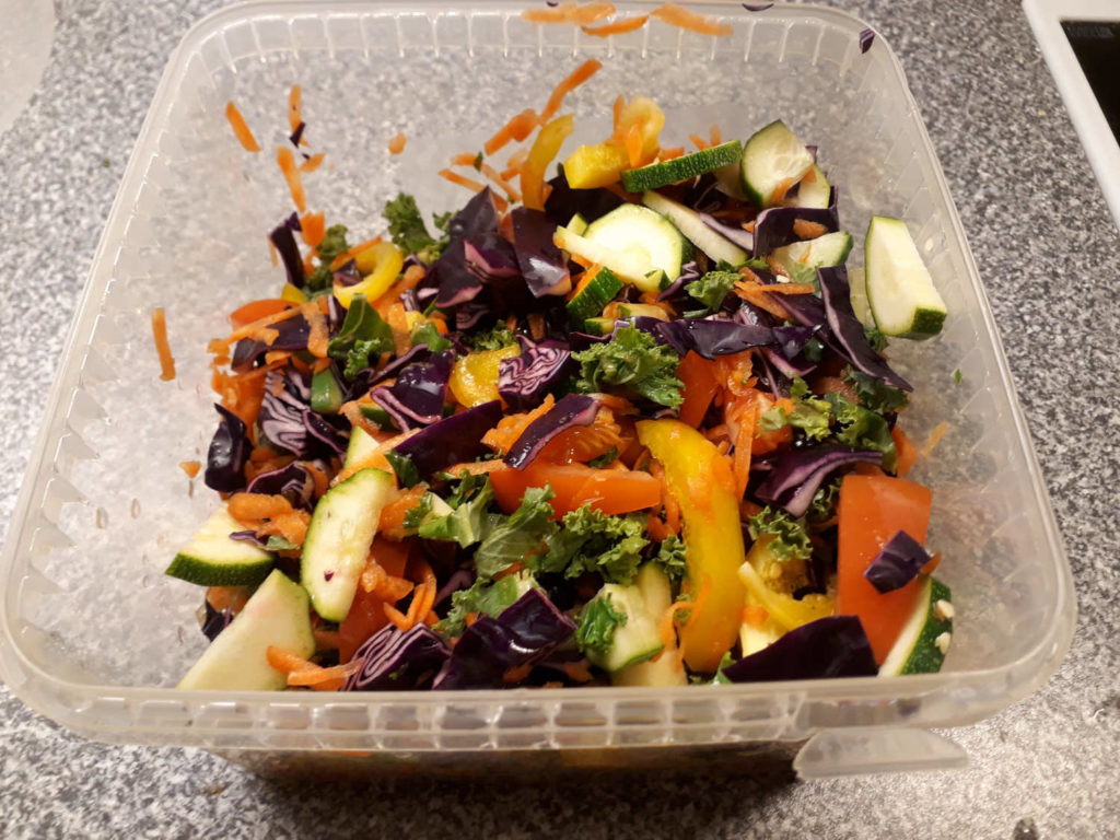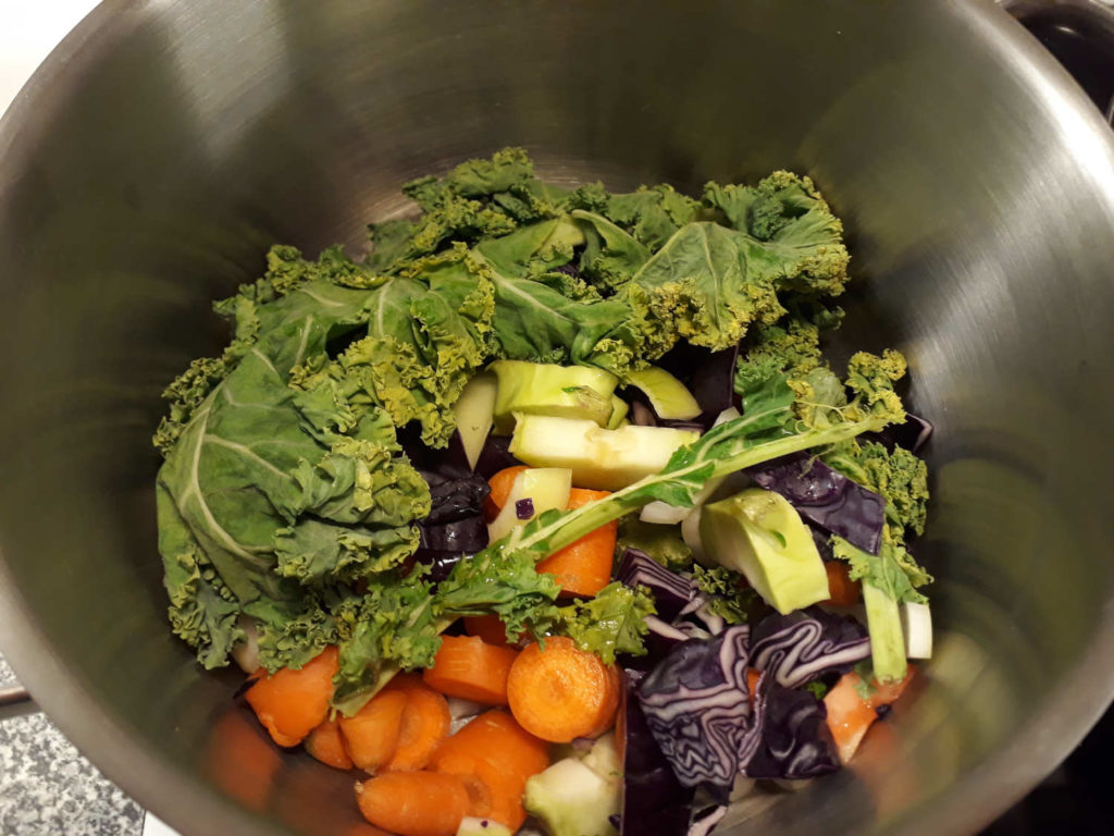 Lehtikaalen raadot meni sitten tänne. Laitoin vähän punakaalia ja tuoretta sipuliakin, sekä yhden porkkanan, kaikkien entisten jämien lisäksi, jotta saa vähän enemmän potkua. Yrtit ja pippurit perään.