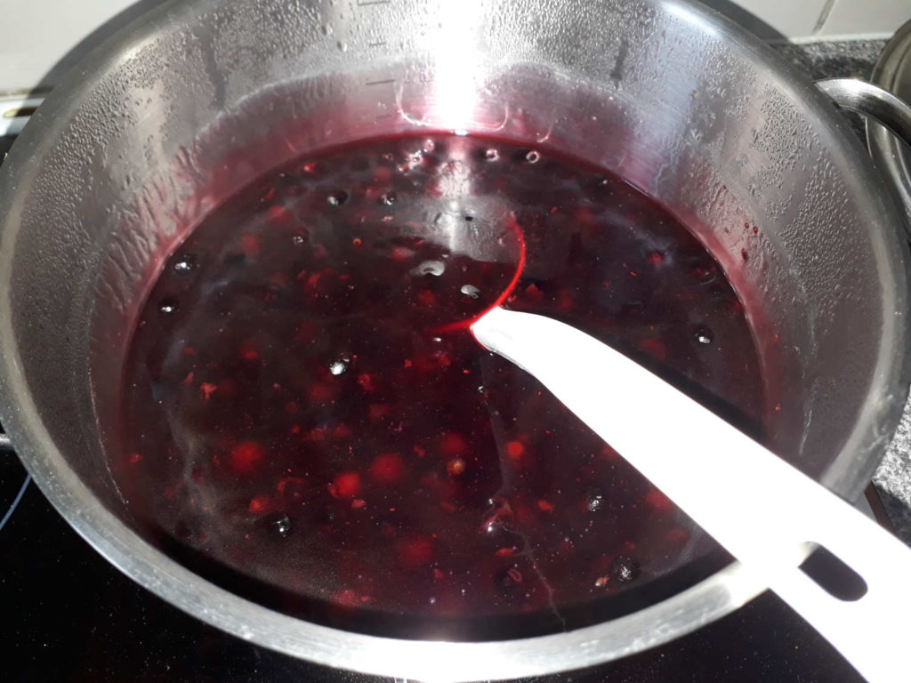 Annoin marjojen kiehu pari minuuttia ja sekoittelin mukaan sokerin. Sitten kippasin tuon perunajauhovellin myös kattilaan, ja sekoittelin vähän aikaa.
