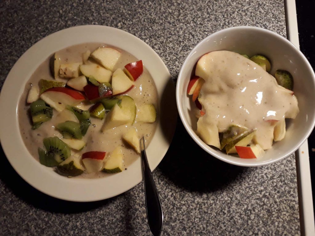 Saunan jälkeen pakastettuja banaaneja ja vähän soijamaitoa tehosekottimeen ja pärinäksi. Sinne pilkoin omenaa, päärynää ja kiiwihetelmän. Tämä on semmonen jäätelö sitten olevinaan. Parempaa ku jäätelö kylläkin. Tuli vaan turhan iso määrä tehtyä, ja toinen annos pitänee laittaa jääkaappiin toivoen että se olisi aamulla syötävää. Tuleepahan sekin testattua.