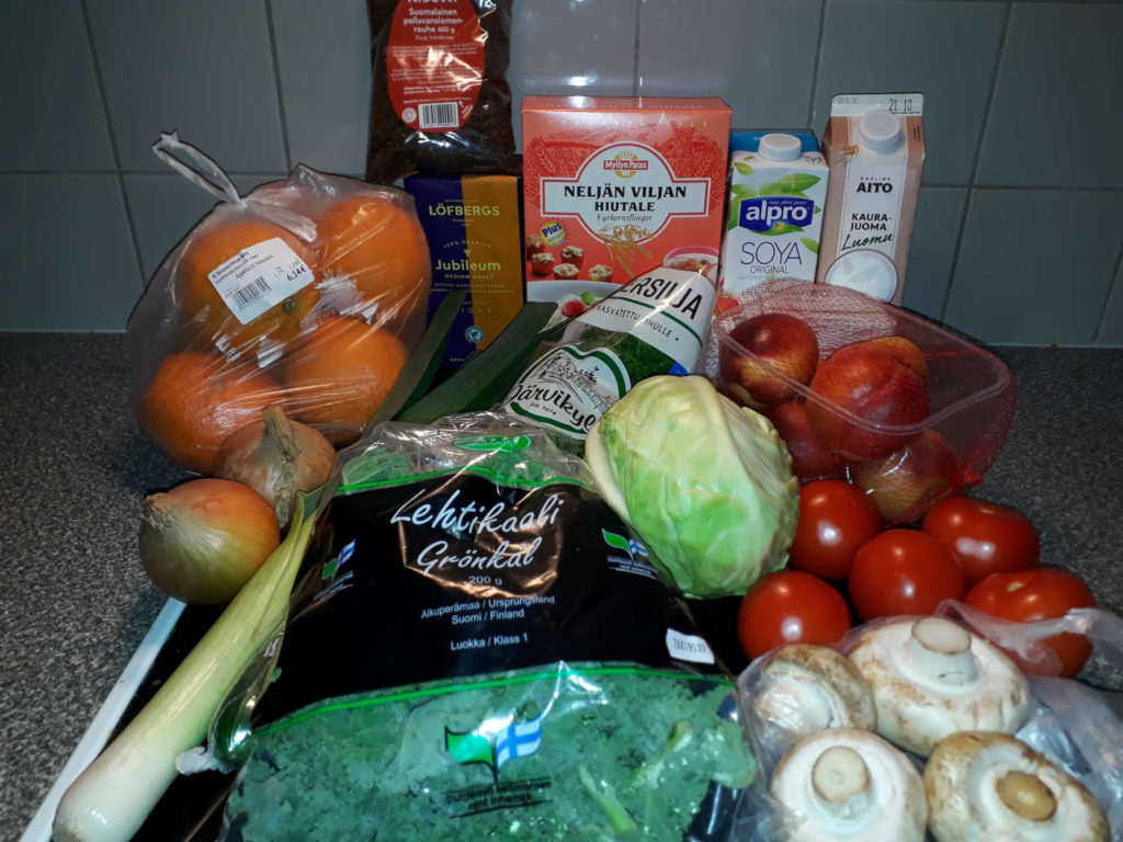 Huoltokeikka: Appelsiinit nektariinit aamupuuroon viikoksi. Lehtisalaattia, kaalia, tomaattia, kurkkua, purjoa, persiljaa… Eli salaattiainekset. Lissää pellavasiemenrouhetta aamupuuroon, lissää neljän viljan aamupuuroa, lissää kaurajuomaa aamupuuroon. Aamukahvia. Tuo Löfbergs Jubileum joku keskipaahto juhlapaahto kahvipaketti, niin ei parempaa kahvia ole tällä hetkellä olemassa. ( se suosikkihan välissä vaihtelee )