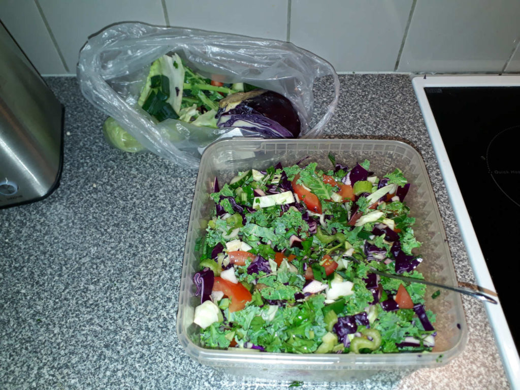 Iso salaatti on kahdenlaista kaalta, kolmenlaista jos lehtikaali lasketaan myös, ja on persiljaa ja on tomaattia ja on kurkkua ja.. Limeä lorisutan päälle myös, ja sekoittelen, koska se tuo kivaa makua, vitamiinia, ja tuntuisi säilyvän kauemmin se salaatti.