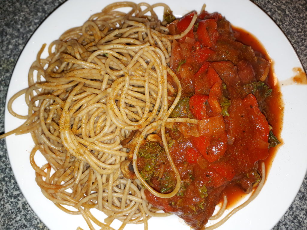 Kauppaan ei jaksa könkkästä mutta jotakin ruokaa pitää tehdä. Onneksi aina löytyy jotakin peruskamaa kaapeista. Onnistui oikeastaan helvetin hyvin tämä seuraava setti. En muista yhtään miten tein suunnitelmat muuttui koko ajan lennossa, ja joka mutkassa lensi lisää maustetta kastikkeeseen. Spagettikastike tämä ei ollut alunperin.