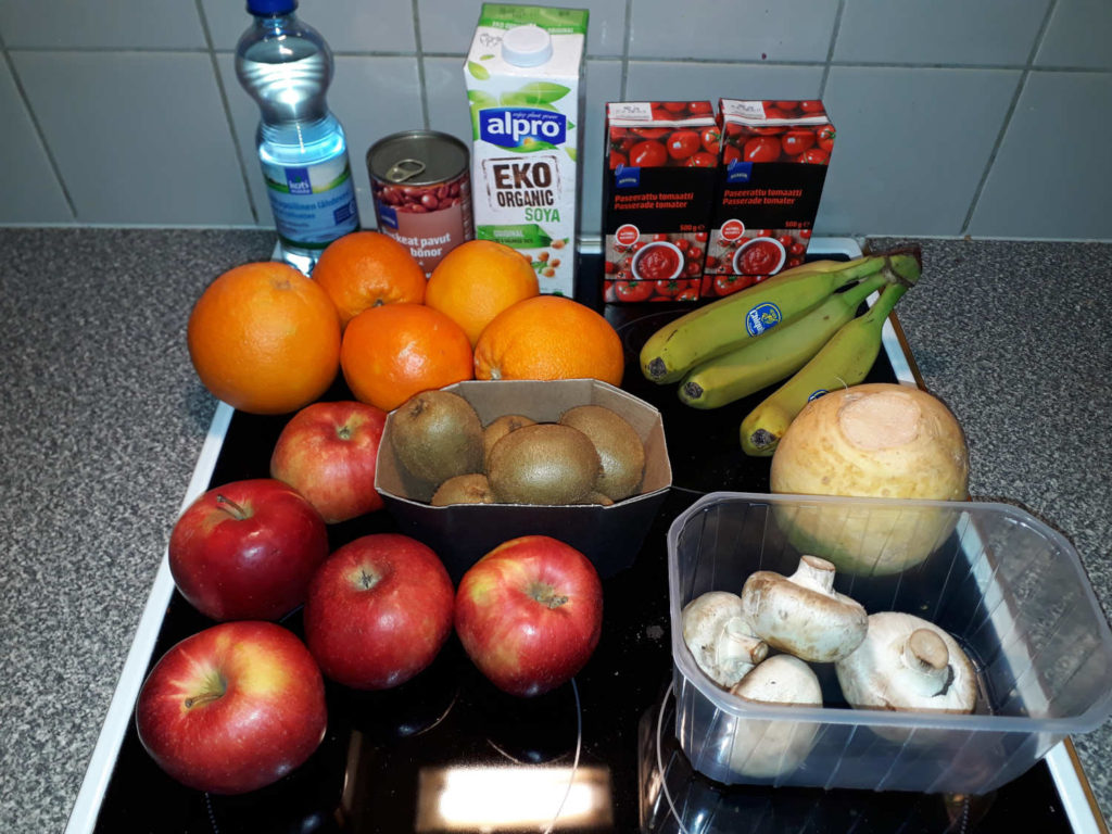 Ainahan siinä sotkeentuu jotakin muutakin mukaan ostoskoriin, vaikka kuinka psyykkaa itseään kauppaan mennessä, että ostat nyt vain ne hedelmät. Muttei se nyt kovin pahasti mennyt tällä kertaa keturalleen. Herkkusieniä ja lanttua laitan heti ruoaksi, eli ne puuttui, ja soijajuomaa voi aina tuoda purkin, ja loput on säilykkeitä sekä tietenkin tuo yksi tuttipullo kitaraharjotuksiin. Ostokset teki yhteensä 13 kolikkoa.