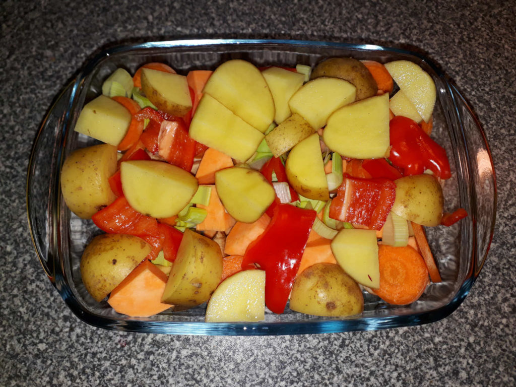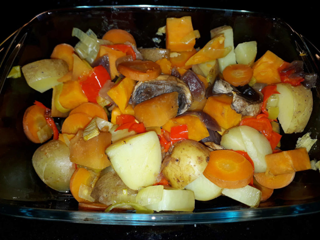 Tätä voi muokkailla ja lämmitellä vaikka mitä. Nyt on lähdössä bataattia, perunaa, paprikaa, porkkanaa, lanttua, sipulia, punasipulia ja vähän purjoa. Ja laitan myöskin mukaan herkkusieniä.