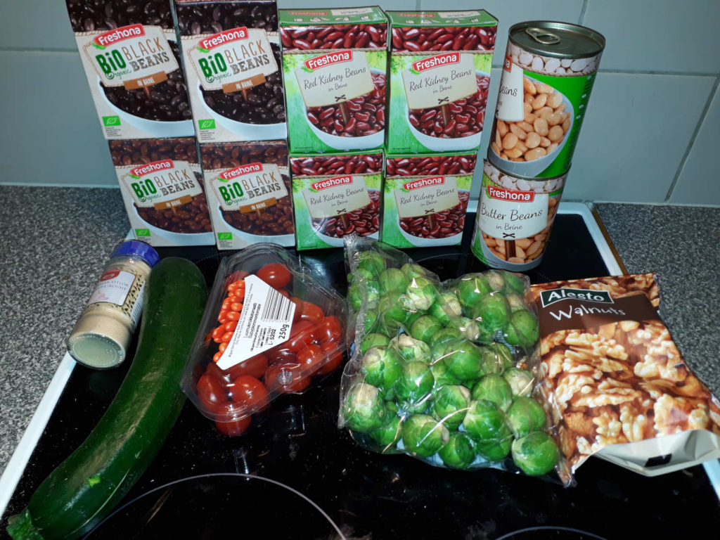 Papuja kaappiin. Jotenkin laiskottanut keitellä lisää papuja enää itse. Tosin on niitä vielä pakkasessakin. Saksanpähkinöitä, tuosta säkistä riittää tosi pitkäksi aikaa. Pieniä ruusukaalia. Valkosipulijauhetta… Tuossahan ne näkyy turhaa tässä selostaa. Nälkäkin on jo!