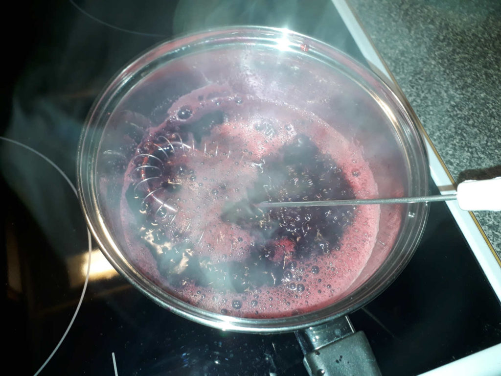 Tällä kertaa nämä marjat pääsi aika rajusti kiehahtaan kun lähdin soittelemaan pianoa ja unohtui hetkeksi koko homma. Ei tarvitse siis kauaa kiehutella. Vispilällä runnoo ja ryskää marjat pieniksi, ja sittenpä se on valmista. Aikaa meni varmaan 10 minuuttia, ehkä.