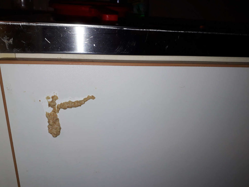 Vittu että se pitää aina räpiä. Miten tuokin on mahdollista, kun en tuollapäinkään keittiötä tehnyt edes sämpylätaikinan kanssa mitään? Hyvä että edes huomasin tuon. Olisi ollut kiva rapsutella huomenna se irti tuosta. Tai lattialta.