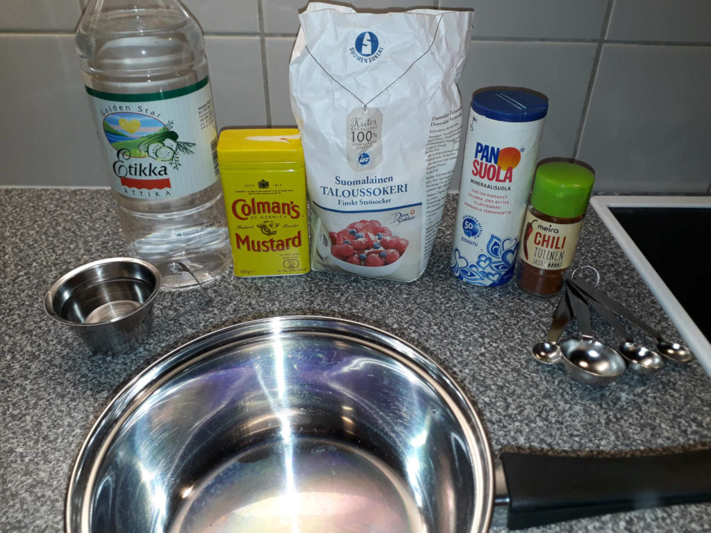 Ainekset: Vesi, etikka, sinappijauhe, sokeri, suola, chilijauhe(tämä voisi olla myös kurkuma, tai mikä vaan, mutta haluan potkua)