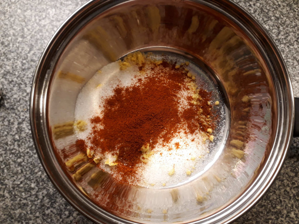 Ensin laitetaan kattilaan sokeri, sinappijauhe, chilijauhe ja suola. Eli kuivat aineet ensin sekoitellaan hyvin keskenään.