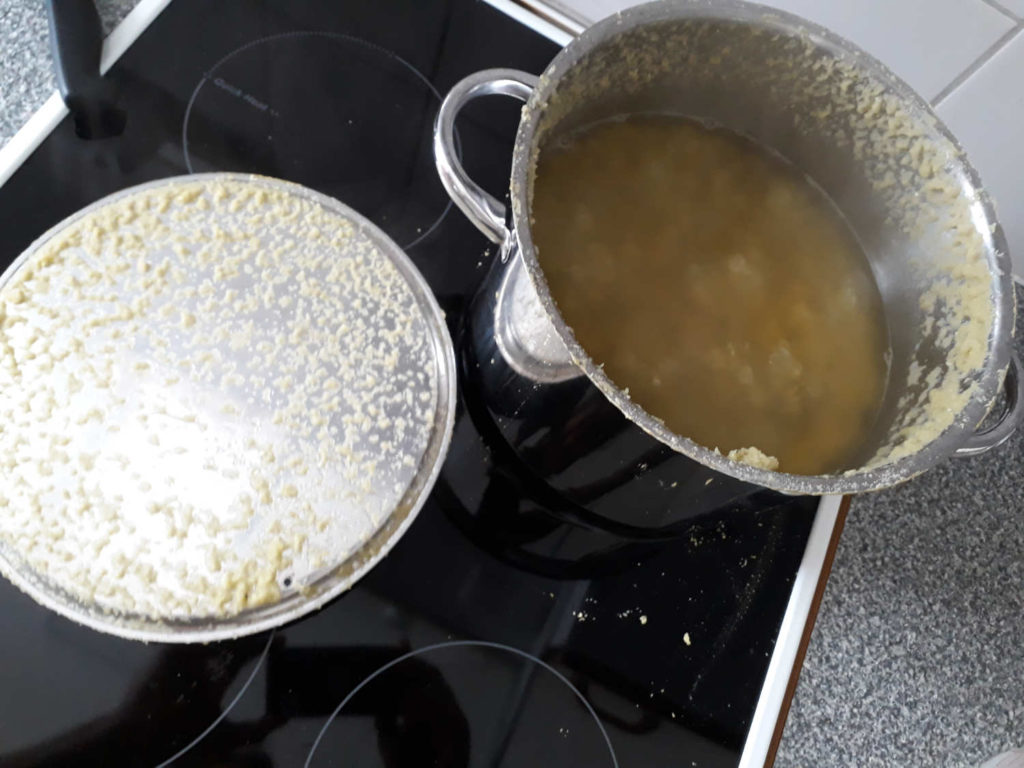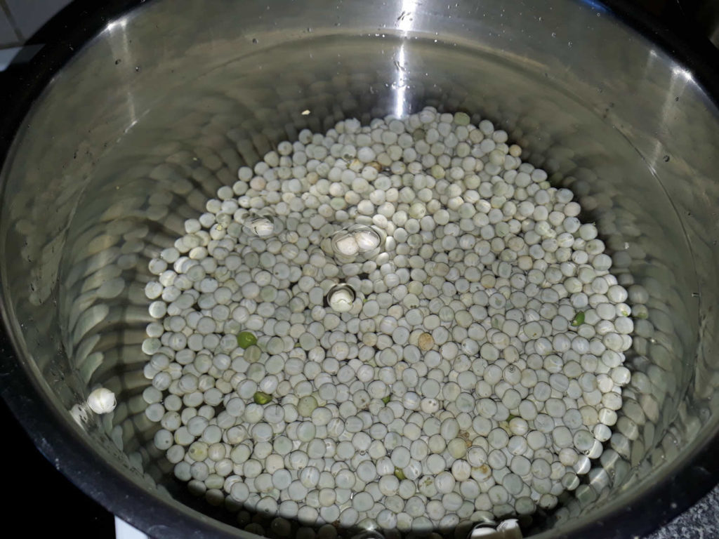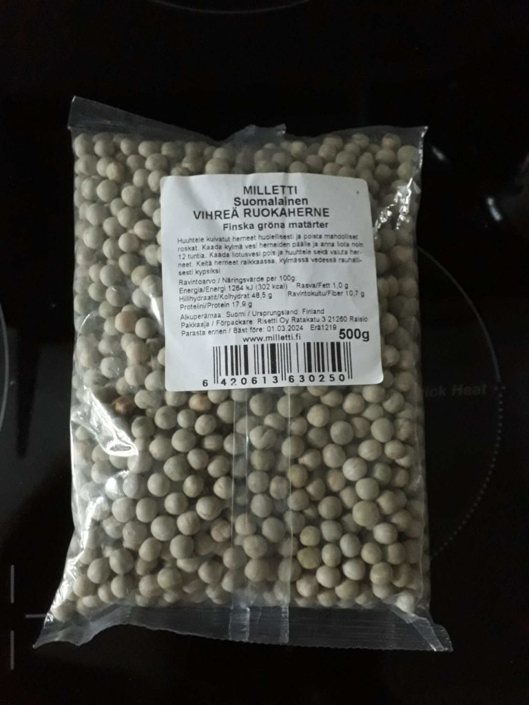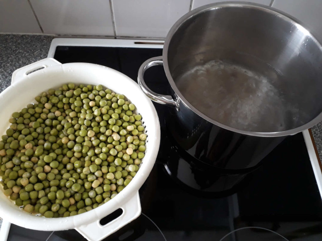 Ensin huuhdellaan herneet ja pistetään veteen kiehumaan. 2 litraa laitoin vettä ohjeen mukaan.
