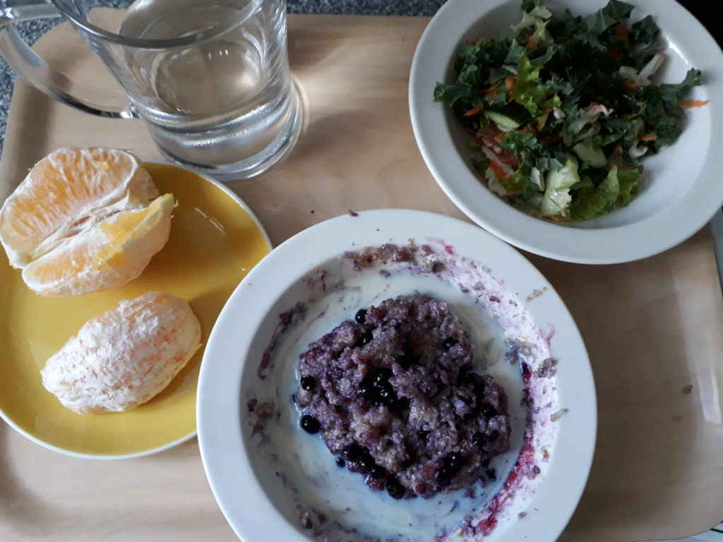 Tällä kertaa lisäsin hedelmänkin mukaan kun jostain oli kaappiin ilmestynyt appelsiini. Kyllä täytyy sanoa, että nyt tuommoinen raikas jääkaappikylmä appelsiinikin maistuu ihan Jaffa limukalta. Mustikat ja pellavasiemenrouheet on mukana puurossa.
